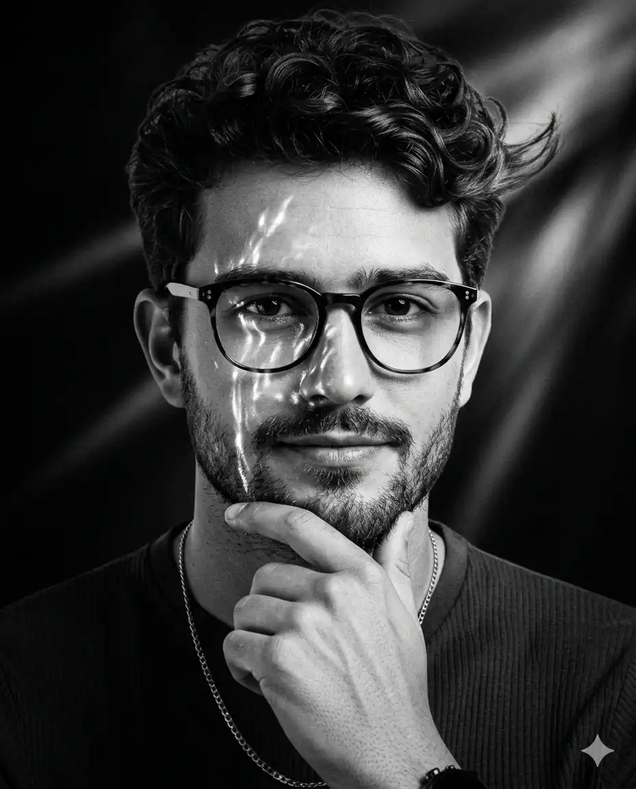 A hyperrealistic 8K black and white cinematic portrait captured in mid-motion, hair slightly lifted as if touched by a soft breeze. The face is illuminated by fractured beams of sunlight, breaking into shimmering streaks that resemble liquid rays under water, flowing diagonally across the skin. The photograph has zero saturation, bold monochrome tones, and extremely high black contrast, creating a powerful editorial mood. The grain is intentional, resembling fine film texture, adding depth and authenticity to the shot. Freckles scatter naturally across the cheeks, full lips catch a subtle glossy highlight, and vivid eyes shine even in monochrome, standing out as the emotional anchor of the portrait. The background is softly blurred into velvety black, with faint hints of abstract light rays fading into the darkness. Dramatic chiaroscuro shapes the face and body, producing sharp edges of light and deep shadows, as though sculpted by the sun. The overall mood is mysterious, raw, and emotionally evocative — a fashion photograph that feels timeless, blending analog imperfection with surreal cinematic beauty. The portrait uses only the person from the attached source photo (person from reference). Face shape, bone structure, and proportions remain exactly unchanged. Skin texture, pores, freckles, wrinkles, and natural asymmetry remain fully intact. Age and natural likeness remain accurate and unaltered. Hairline, hair density, hairstyle, and volume remain exactly as in the source image. No beautification, no face alteration, no symmetry correction, no feature enhancement. Maintain true identity and facial authenticity with 1:1 likeness to the reference photo. Aspect ratio 4:5