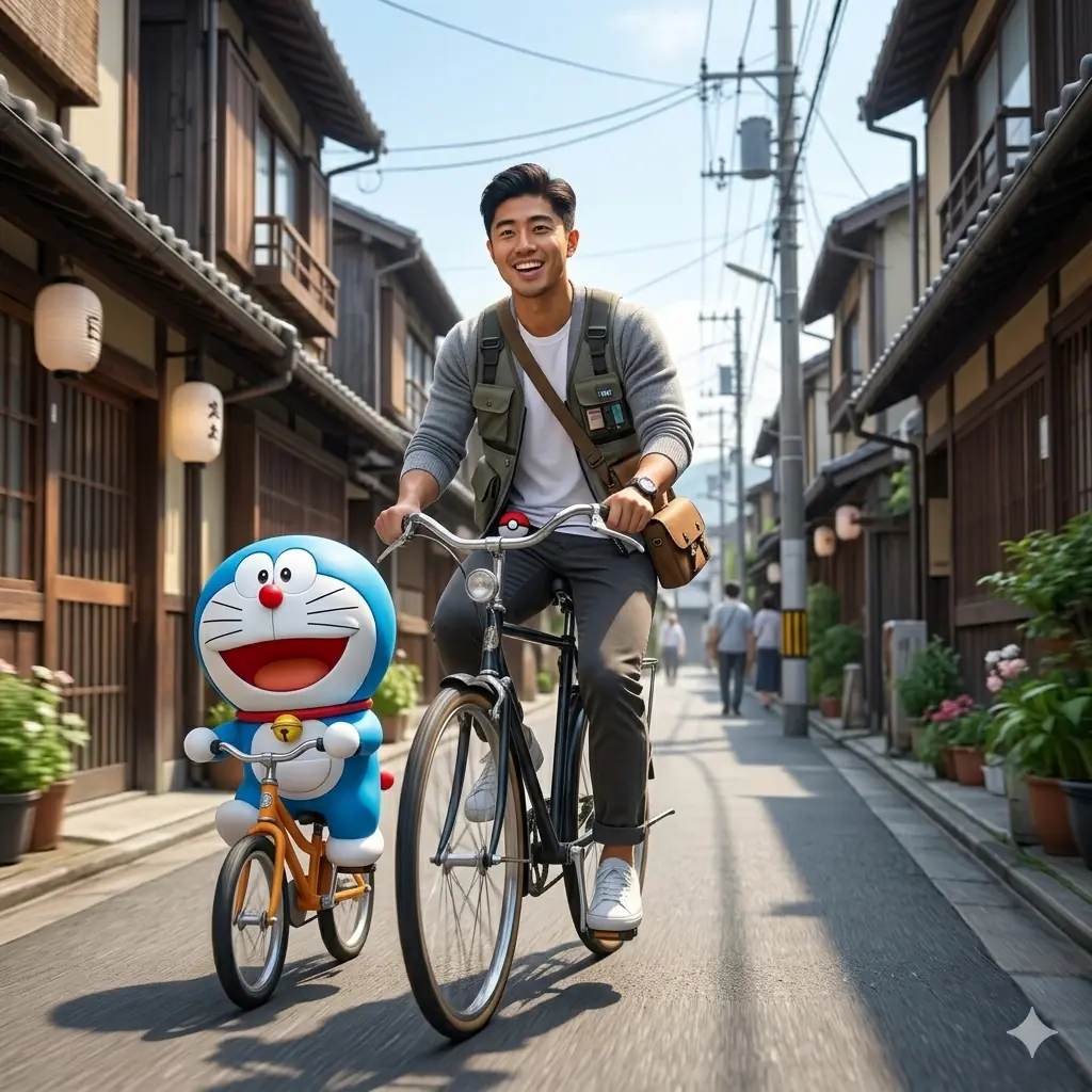 Create a hyper-realistic cinematic photo inspired by the reference scene — use face reference exactly. Keep the same Japanese-style street with traditional houses, a clean road, bright sunny daylight, soft natural shadows, and subtle motion blur. Place the subject riding a bicycle in the exact same camera angle, body posture, and lighting as the reference, capturing smooth forward movement and a lively street atmosphere. Beside him, add a 3D-style cartoon character similar to Doraemon, also riding a bicycle, scaled realistically with accurate perspective, shadows, and ground contact. Both riders should share a playful, energetic mood, as if enjoying a carefree ride together. Colors should remain natural and vibrant, with crisp textures, realistic depth of field, and an ultra-HD photography look that blends cinematic realism with lighthearted charm.