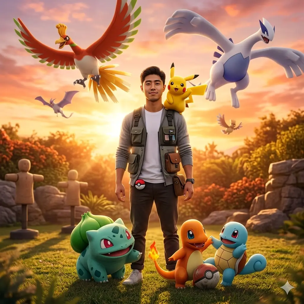 “Ultra-realistic 8K cinematic portrait of the young man in the photo ‘without any facial modification’ as a Pokémon Trainer, centered and posing confidently, smiling very ‘very subtly’ naturally. Surrounding the user are friendly Pokémon: Pikachu, Bulbasaur, Charmander, and Squirtle, interacting in playful and dynamic ways, some leaning towards the user. The background is a vibrant, sunlit training ground, featuring soft shadows, cinematic lighting, and a spectacular sunset sky with warm orange and pink hues. In the sky, Legendary Pokémon soar majestically, illuminated by the golden sunlight, appearing larger and more prominent for an epic effect. Lifelike Pokémon fur, clothing, and textures, HDR lighting, sharp details, natural yet vivid colors, realistic lens flares, wide-angle perspective, shallow depth of field, and subtle motion blur for dynamic energy. Framed composition like a heroic game poster, capturing a joyful atmosphere, Adventurous and epic Pokémon trainer.”