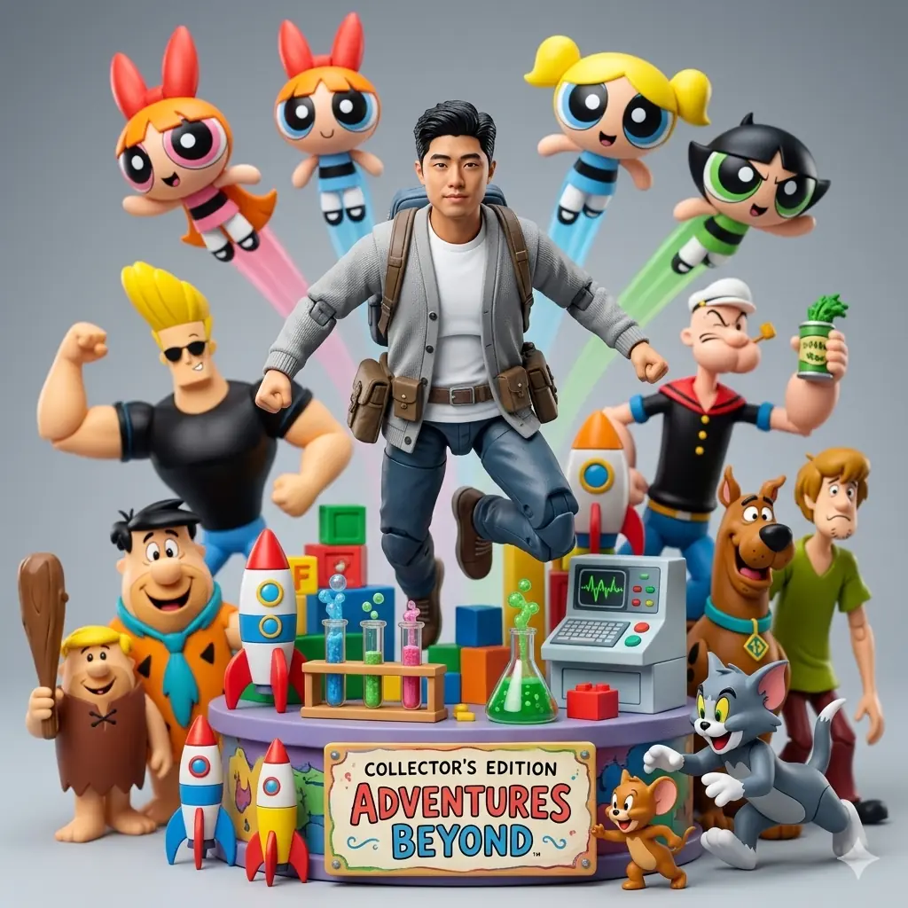 AN ACTION FIGURE OF SAME PERSON IN IMAGE POSED DYNAMICALLY AT THE CENTER OF A HIGHLY DETAILED, TOY-THEMED PEDESTAL SURROUNDED BY CARTOON ACTION FIGURES INCLUDING DEXTER FROM DEXTER’S LABORATORY, THE POWERPUFF GIRLS (BLOSSOM, BUBBLES, AND BUTTERCUP), JOHNNY BRAVO, POPEYE, FRED FLINTSTONE AND BARNEY RUBBLE FROM THE FLINTSTONES, TOM AND JERRY, AND SCOOBY-DOO WITH SHAGGY. THE PEDESTAL IS ELABORATE AND WHIMSICAL, CONSTRUCTED FROM TOY VERSIONS OF THE CHARACTERS’ ICONIC ITEMS AND WORLDS.
